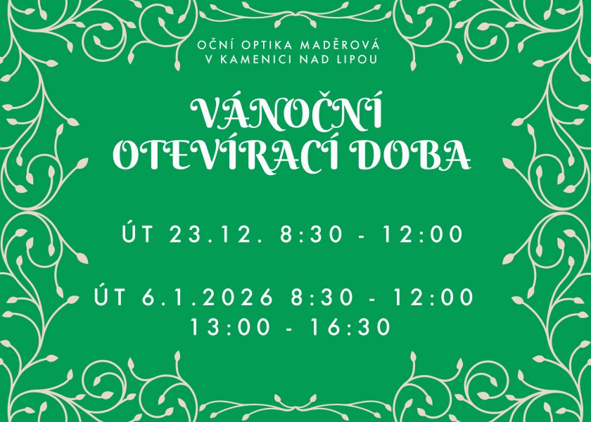 Milí zákazníci, v době vánočních svátků si i my dopřejeme trochu klidu a pohody, a proto Vám přinášíme naši vánoční otevírací dobu. Děkujeme za Vaši důvěru a přízeň po celý rok 2025 a do příštího roku přejeme hlavně zdraví a jasný pohled! ...